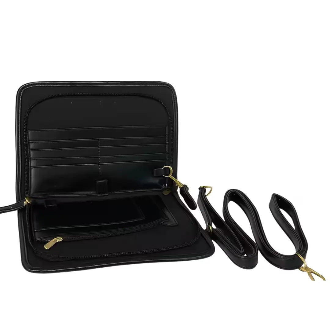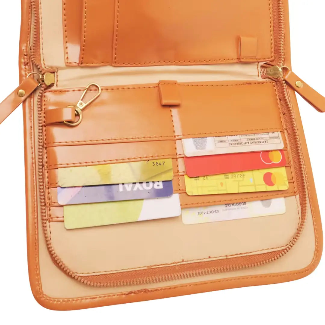 Su diseño tipo billetera permite llevar lo esencial bien organizado, sin cargar bolsos grandes ni perder elegancia.